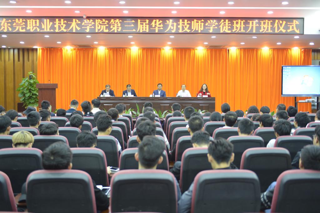 2018年1月3日下午3:00,东莞职业技术学院第三届信鸿-华为技师学徒班在行政楼1B201举行隆重的开班仪式。出席本次开班仪式的领导和嘉宾有学院党委书记朱益民同志、院长贺定修教授、副院长李奎山教授,华为机器有限公司人力资源部部长吴正刚先生和东莞市信鸿人力资源管理有限公司总经理刘贤春女士,学院和企业代表以及第三届信鸿-华为技师学徒班学生。开班仪式由李奎山副院长主持。