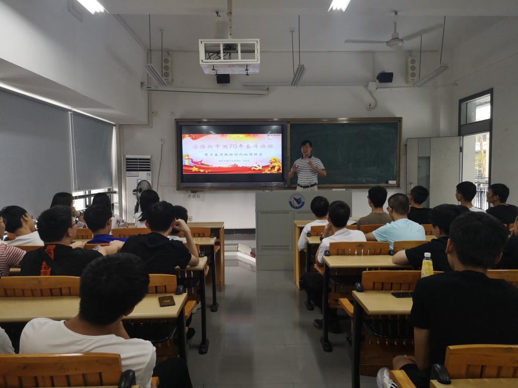 2019年9月26日上午,电子与电气工程学院党总支书记、院长卞建勇副教授在教一204为2019级电子信息工程技术专业2年1班的同学讲授了主题为《感悟新中国70年奋斗历程,努力奋进做新时代祖国栋梁》的思想政治理论课。